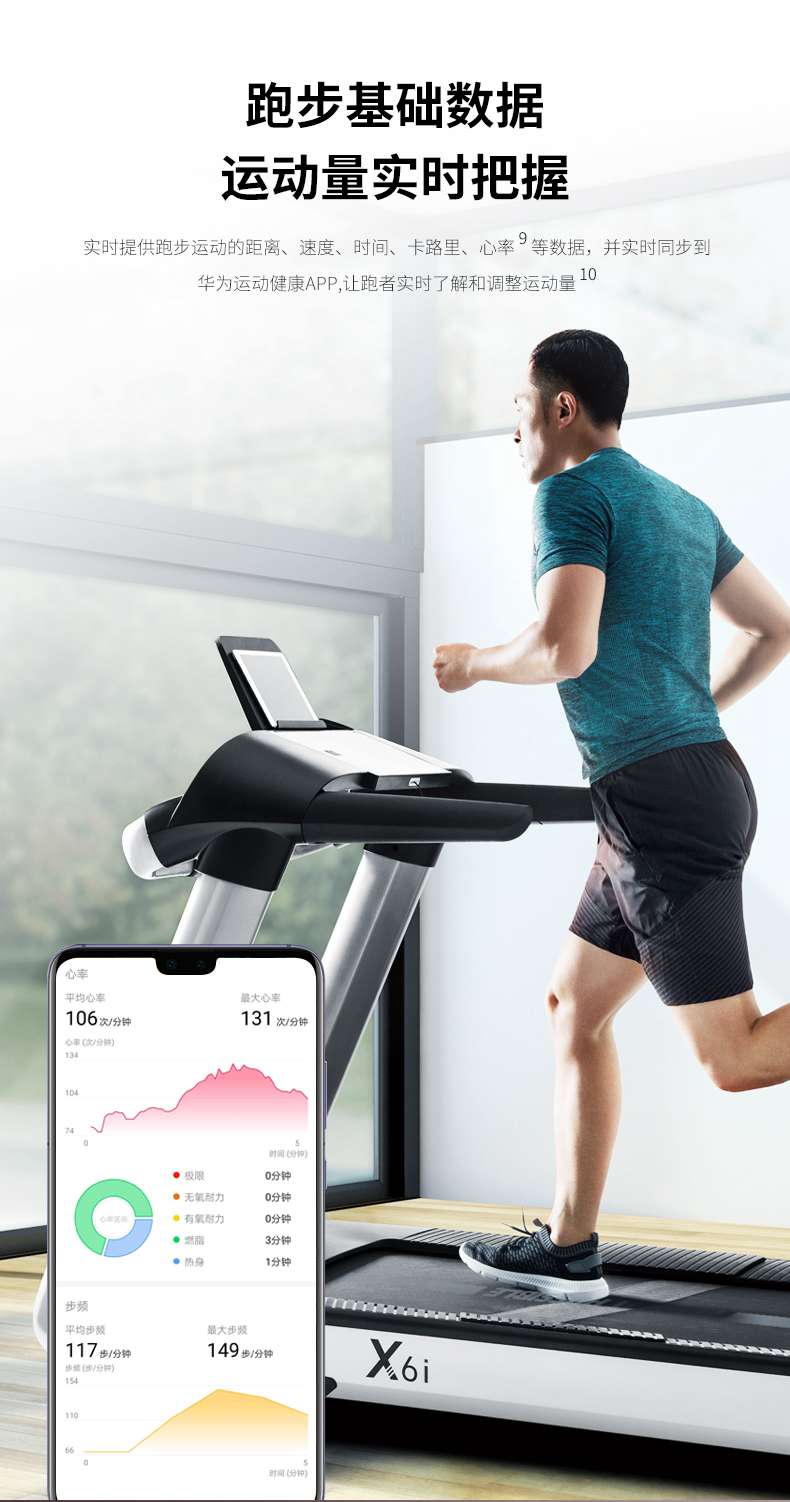 KS娱乐体育跑步机-X6心率跑步机,可根据用户运动是实时心率,跑步机自动调节跑步速度、坡度等进行运动强度的调节,更科学;X6i华为版跑步机,可以通过连接华为运动健康APP,监测多种类型跑步数据。欢迎来电咨询~