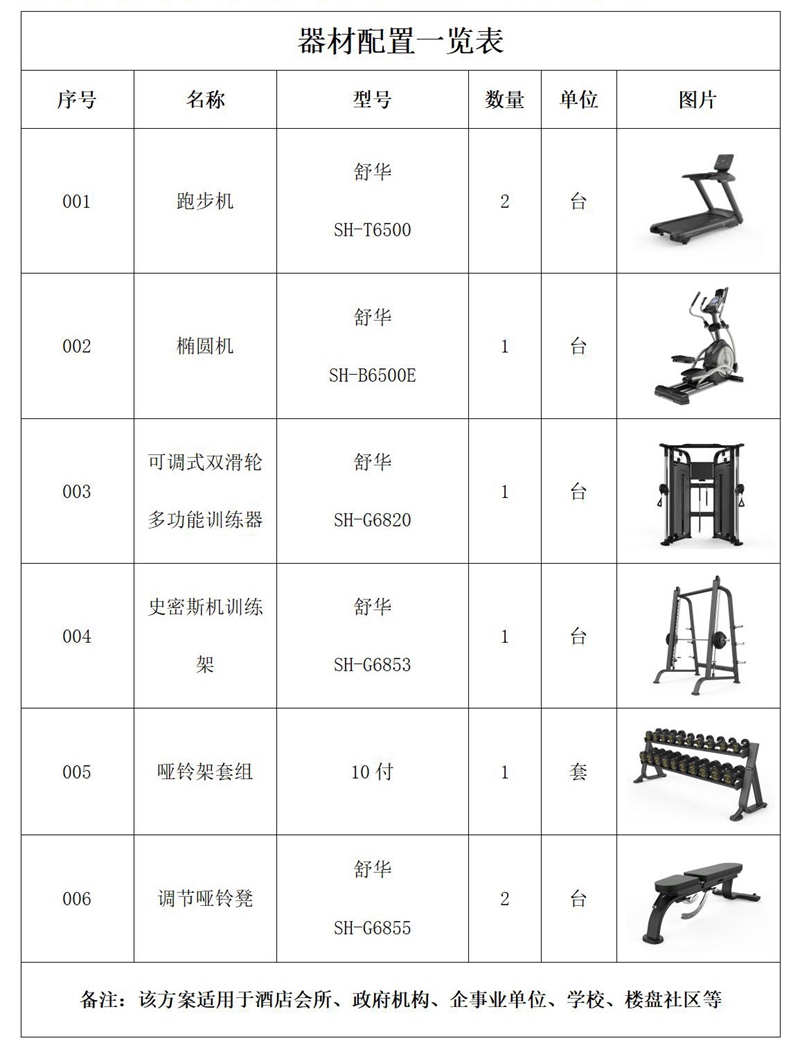 此方案要求面积小于40平米,KS体育官方会根据您个人的实际情况和场地面积而定。此方案推荐小型单位健身房、酒店会所健身房配置。能满足5-10人同时健身使用。