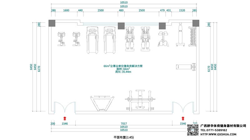 此方案要求面积小于66m²,适用于企事业单位、酒店会所、楼盘社区、学校等健身场所,能满足10-15人同时健身使用。(方案根据场地空间大小、预算、产品需求等进行配置仅为启发性参考)