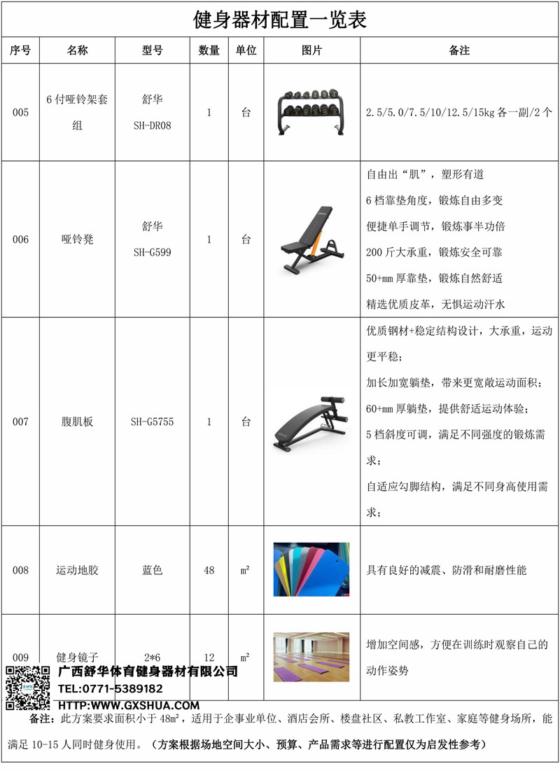 此方案要求面积小于48m²,适用于企事业单位、酒店会所、楼盘社区、私教工作室、家庭等健身场所,能满足10-15人同时健身使用。(方案根据场地空间大小、预算、产品需求等进行配置仅为启发性参考)
