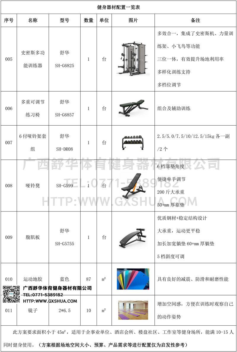 此方案要求面积小于45m²,适用于企事业单位、酒店会所、楼盘社区、工作室等健身场所,能满10-15人同时健身使用。(方案根据场地空间大小、预算、产品需求等进行配置仅为启发性参考)