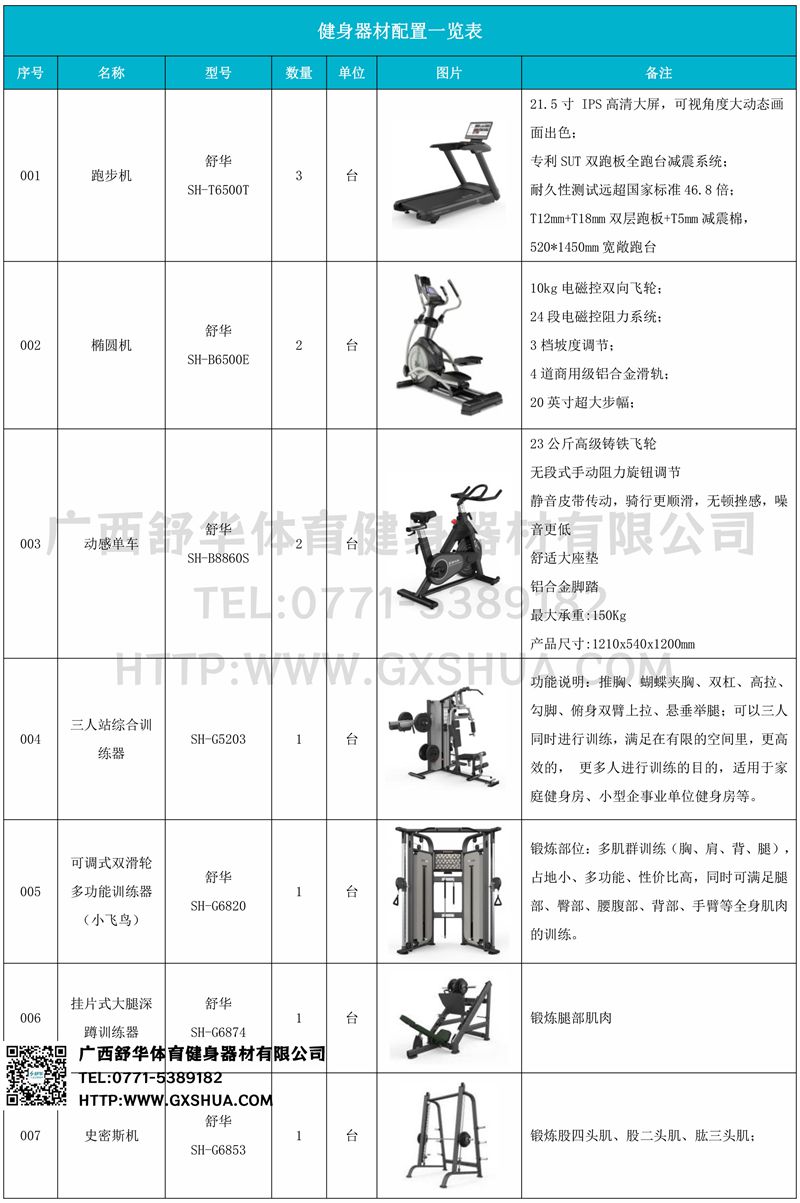 小飞鸟(1台)、挂片式大腿深蹲训练器(1台)、史密斯机(1台)、多重可调节练习椅(1台)、腹肌板(1台)、10付哑铃套组(1套)、哑铃凳(1台)、可以实现对不同肌肉群的针对性训练,满足肌肉训练需求,全方位激活身体机能。