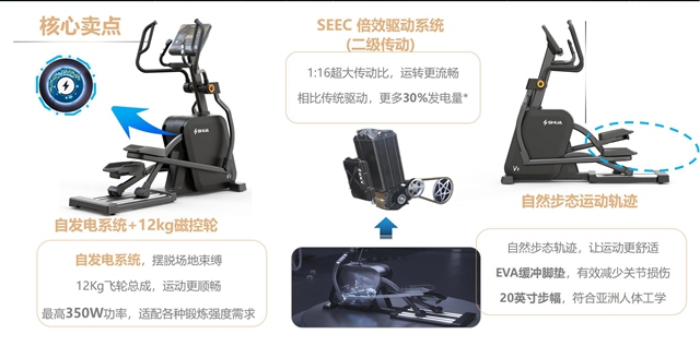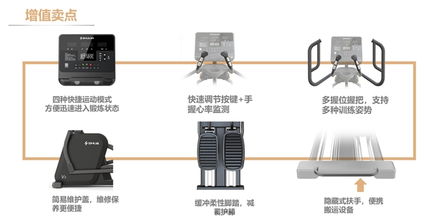 安全稳重,细节制胜。KS娱乐体育V8椭圆机是一款高安全系数的椭圆机,整体设计遵循人体工学科学,缓震踏板中添加减震层设计,能够有效减少运动冲击带来的关节损伤,且最大支持160kg载重,满足更多人群。手握心率监测、多功能置物架、自发电系统取代统电源......在细节上,新款椭圆机站在健身者角度,添加了不少设计者的巧思,为健身者带来更贴心的体验。