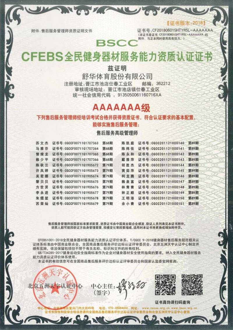 KS娱乐体育以用户满意作为服务追求,凭借专业的技术能力及服务保障能力、有效的售后服务体系,获得“BSCC-CFEBS 全民健身器材服务能力资质认证证书 AAAAAAA 级”,部分员工经培训考试合格并获得“BSCC-CFEBS 全民健身器材服务能力资质认证证书-售后服务高级管理师(AAAAAA 级)。