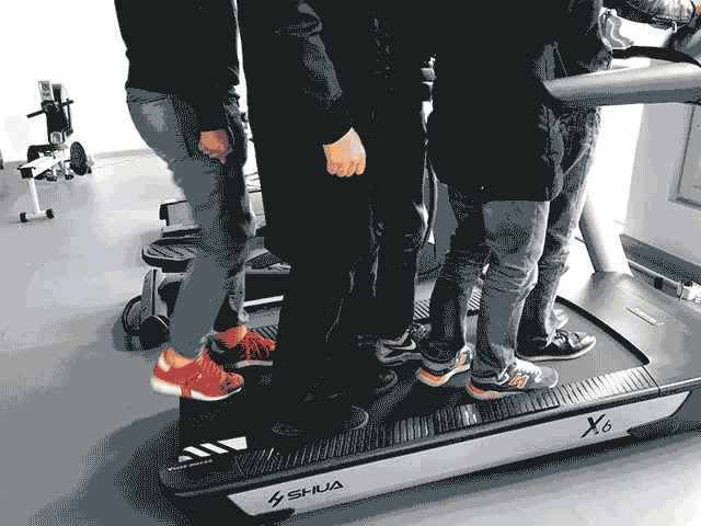 小编先和另外三个同事,一共四个人(约等于550斤)在上面站着,发现机器毫无压力继续正常运转。(看上图)小编不服, 为了检测这台机器究竟能承受多少重量,小编又加了一个人上去(总重量约等于700斤)。